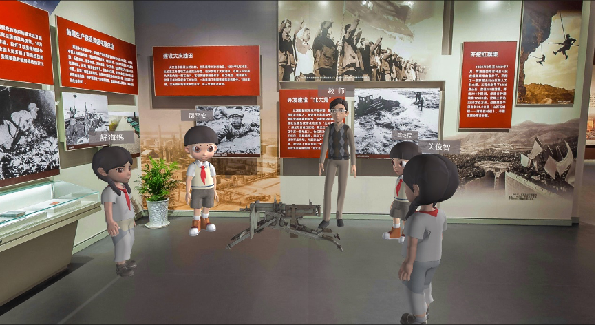 3) 最后,根据需求,参与者进入虚拟场景后可以自己定制场景和互动,比如使用成体系的720°革命展厅、互动组件、党史和长征中经典场景和视频讲解,各种三维的革命文物,AI模块、互动程序或互动模型等,参与者也可以使用和定制 语音识别模块,调用习题和问答等。