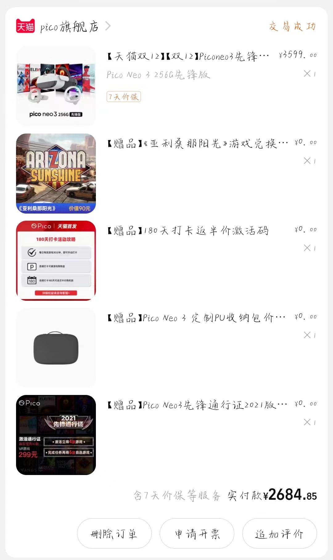 时间长了游戏也就玩腻了,刚好有次逛商场的时候看到有个VR体验区,当时在店里体验了俩小时多的《半条命:艾利克斯》,没玩过瘾,回家之后淘宝就开始推荐VR一体机了(这该死的大数据,精准推送)