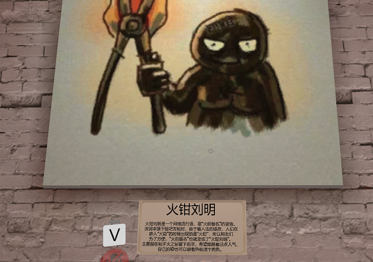 展厅的墙上都挂着一些老梗的图,下面附文介绍着梗的背景故事,比如像火钳刘明: