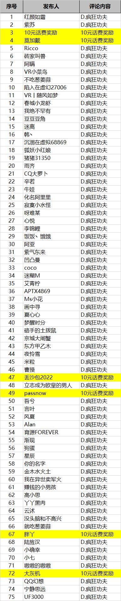 3、 在抽奖编号中抽取3名用户,每人奖励10元话费充值券;