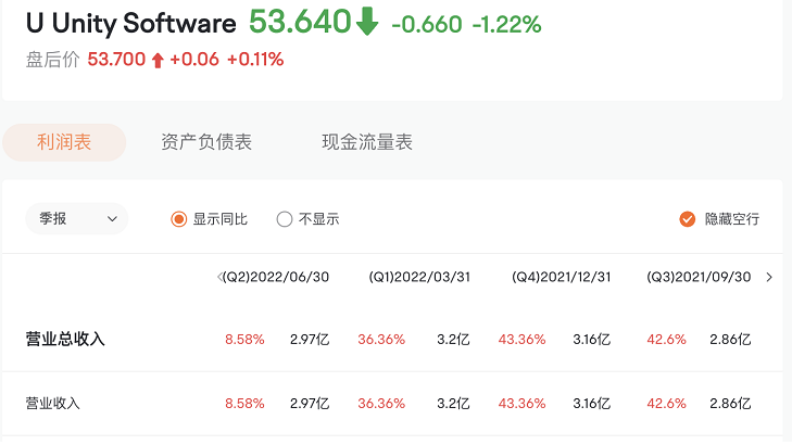 根据Unity公布的财报,在统计截止至 6 月 30 日的三个月里,公司营收 2.97 亿美元,同比上升了 9%。同时,第二季度净亏损从去年同期的1.48亿美元扩大到了2.04亿美元。上半年净亏损也从2.55亿美元扩大到了3.81亿美元。