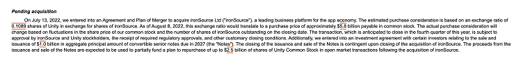 让我们按时间线了解一下,近期围绕Unity发生的这几件事情到底是什么。第一件事,7月14日,Unity宣布与企业级平台ironSource达成合并。根据协议,ironSource 将通过全股票交易合并为 Unity的全资子公司。其中每股ironSource普通股将换取0.1089股Unity普通股。交易完成后,目前 Unity 股东将拥有约73.5%的股份,而 IronSource 现有股东将拥有合并后公司约26.5%的股份。报道称,本次合并将于今年第四季度完成。
