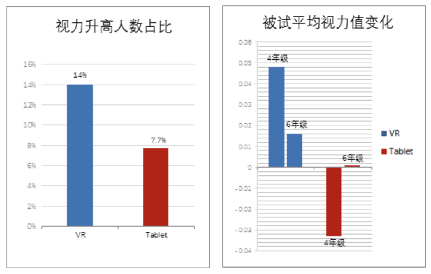他们将50名小学生分成了两组,让他们分别体验60分钟的平板电脑和VR设备,然后测试他们的眼睛受刺激程度、视野模糊情况,视力变化等一系列可观测数值。
